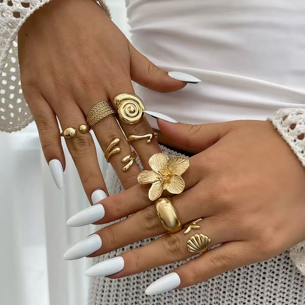 Un ensemble de 8 bagues dorées aux motifs inspirés de la mer et de la nature — soleil, fleurs, coquillages, vagues et spirales. Léger, polyvalent et idéal pour toutes les occasions. Deux variantes disponibles : Version Légère (25,7 g) et Version Plus Complète (36 g).